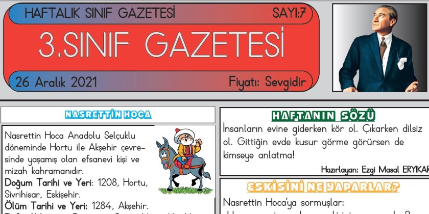 3. Sınıf gazetemiz yedinci sayısı ile yayında.