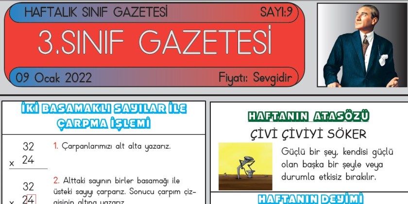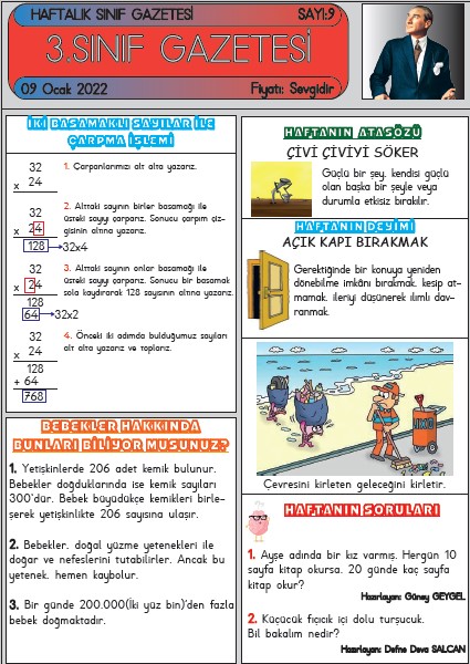 SINIF GAZETEMİZİN 9. SAYISI ÇIKTI Ocak 9, 2022 sinifininogretmeni SINIF GAZETESİ Yorum bırakın SINIF GAZETESİ SAYI 9 SINIF GAZETEMİZ YAYIMLANDI 3. Sınıf gazetemiz dokuzuncu sayısı ile yayında. Gazetemiz 6 Kasım’dan itibaren her hafta düzenli olarak yayımlanmaktadır. ESKİ SAYILARIMIZ SAYI 2 – SAYI 3 – SAYI 4 – SAYI 5 – SAYI 6 – SAYI 7 – SAYI 8 9. SAYI İÇİN TIKLAYIN Bunu paylaş: Facebook üzerinde paylaş (Yeni pencerede açılır) Facebook WhatsApp'ta paylaş (Yeni pencerede açılır) WhatsApp Telegram'da paylaş (Yeni pencerede açılır) Telegram X'te paylaşın (Yeni pencerede açılır) X Beğen Yükleniyor... İlgili