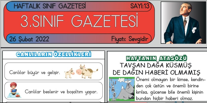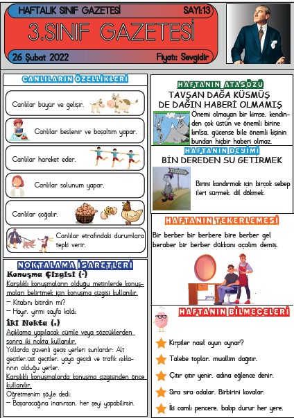 SINIF GAZETEMİZİN 13. SAYISI ÇIKTI Şubat 26, 2022 sinifininogretmeni SINIF GAZETESİ Yorum bırakın SINIF GAZETESİ SAYI 13 SINIF GAZETEMİZ YAYIMLANDI 3. Sınıf gazetemiz on üçüncü sayısı ile yayında. Gazetemiz 6 Kasım’dan itibaren her hafta düzenli olarak yayımlanmaktadır. ESKİ SAYILARIMIZ SAYI 5 – SAYI 6 – SAYI 7 – SAYI 8 – SAYI 9 – SAYI10 – SAYI 11 – SAYI 12 13. SAYI İÇİN TIKLAYIN Bunu paylaş: Facebook üzerinde paylaş (Yeni pencerede açılır) Facebook WhatsApp'ta paylaş (Yeni pencerede açılır) WhatsApp Telegram'da paylaş (Yeni pencerede açılır) Telegram X'te paylaşın (Yeni pencerede açılır) X Beğen Yükleniyor... İlgili