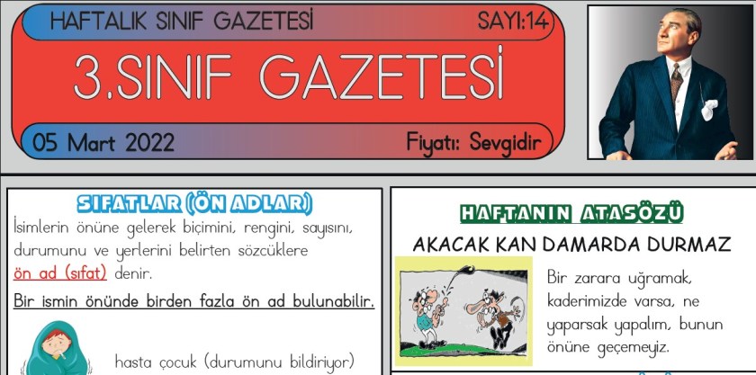 SINIF GAZETEMİZİN 15. SAYISI ÇIKTI Mart 12, 2022 sinifininogretmeni SINIF GAZETESİ Yorum bırakın SINIF GAZETESİ SAYI 15 SINIF GAZETEMİZ YAYIMLANDI 3. Sınıf gazetemiz on beşinci sayısı ile yayında. Gazetemiz 6 Kasım’dan itibaren her hafta düzenli olarak yayımlanmaktadır. ESKİ SAYILARIMIZ SAYI 7 – SAYI 8 – SAYI 9 – SAYI10 – SAYI 11 – SAYI 12 – SAYI 13 – SAYI14 15. SAYI İÇİN TIKLAYIN Bunu paylaş: Facebook üzerinde paylaş (Yeni pencerede açılır) Facebook WhatsApp'ta paylaş (Yeni pencerede açılır) WhatsApp Telegram'da paylaş (Yeni pencerede açılır) Telegram X'te paylaşın (Yeni pencerede açılır) X Beğen Yükleniyor... İlgili