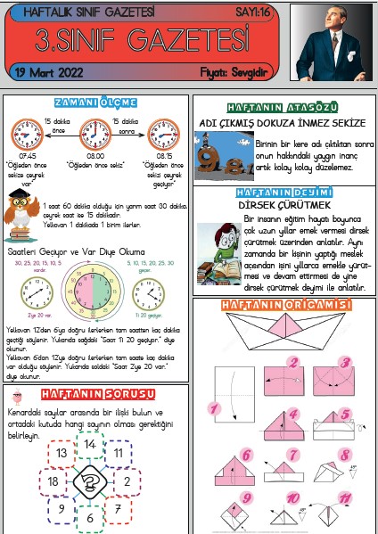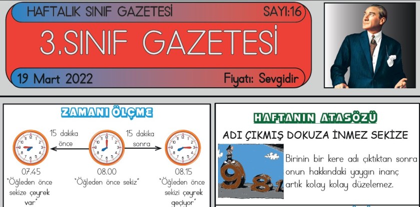 SINIF GAZETEMİZİN 16. SAYISI ÇIKTI Mart 19, 2022 sinifininogretmeni SINIF GAZETESİ Yorum bırakın SINIF GAZETESİ SAYI 16 SINIF GAZETEMİZ YAYIMLANDI 3. Sınıf gazetemiz on altıncı sayısı ile yayında. Gazetemiz 6 Kasım 2021 den itibaren her hafta düzenli olarak yayımlanmaktadır. ESKİ SAYILARIMIZ SAYI 8 – SAYI 9 – SAYI10 – SAYI 11 – SAYI 12 – SAYI 13 – SAYI14 – SAYI15 16. SAYI İÇİN TIKLAYIN Bunu paylaş: Facebook üzerinde paylaş (Yeni pencerede açılır) Facebook WhatsApp'ta paylaş (Yeni pencerede açılır) WhatsApp Telegram'da paylaş (Yeni pencerede açılır) Telegram X'te paylaşın (Yeni pencerede açılır) X Beğen Yükleniyor... İlgili