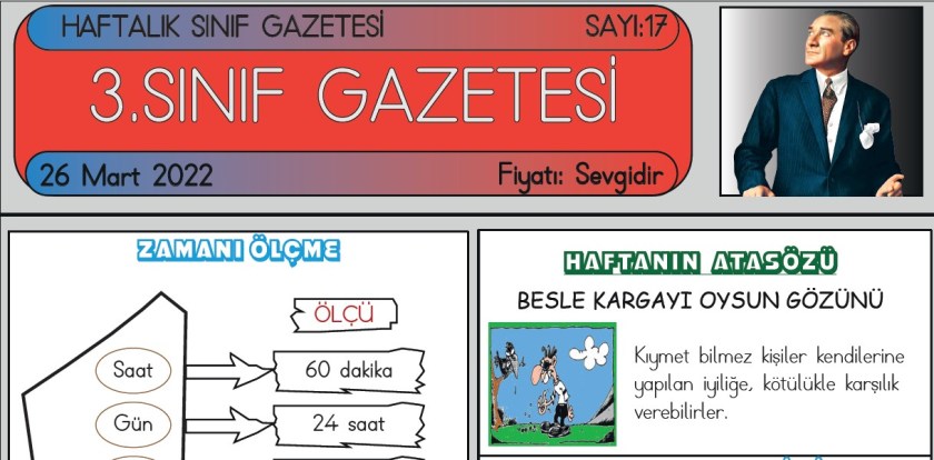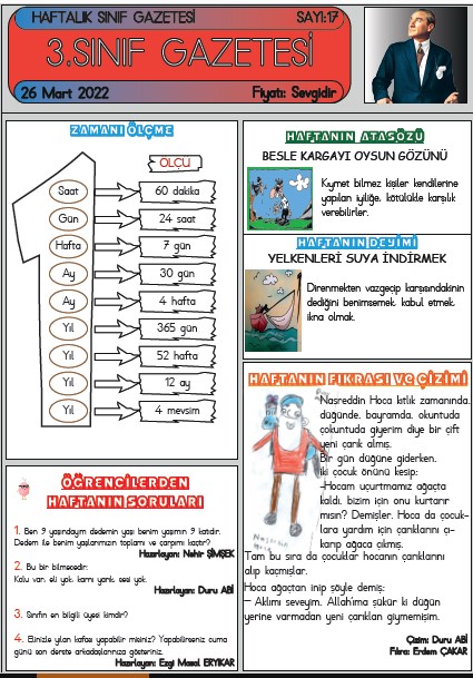 SINIF GAZETEMİZİN 17. SAYISI ÇIKTI Mart 26, 2022 sinifininogretmeni SINIF GAZETESİ Yorum bırakın SINIF GAZETESİ SAYI 17 SINIF GAZETEMİZ YAYIMLANDI 3. Sınıf gazetemiz on yedinci sayısı ile yayında. Gazetemiz 6 Kasım 2021 den itibaren her hafta düzenli olarak yayımlanmaktadır. ESKİ SAYILARIMIZ SAYI 8 – SAYI 9 – SAYI10 – SAYI 11 – SAYI 12 – SAYI 13 – SAYI14 – SAYI15 – SAYI16 17. SAYI İÇİN TIKLAYIN Bunu paylaş: Facebook üzerinde paylaş (Yeni pencerede açılır) Facebook WhatsApp'ta paylaş (Yeni pencerede açılır) WhatsApp Telegram'da paylaş (Yeni pencerede açılır) Telegram X'te paylaşın (Yeni pencerede açılır) X Beğen Yükleniyor... İlgili