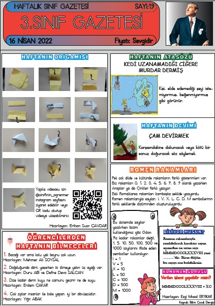 SINIF GAZETEMİZİN 19. SAYISI ÇIKTI Nisan 16, 2022 sinifininogretmeni SINIF GAZETESİ Yorum bırakın SINIF GAZETESİ SAYI 19 SINIF GAZETEMİZ YAYIMLANDI 3. Sınıf gazetemiz on dokuzuncu sayısı ile yayında. Gazetemiz 6 Kasım 2021 den itibaren her hafta düzenli olarak yayımlanmaktadır. ESKİ SAYILARIMIZ SAYI 9 – SAYI10 – SAYI 11 – SAYI 12 – SAYI 13 – SAYI14 – SAYI15 – SAYI16 – SAYI 17 – SAYI 18 19. SAYI İÇİN TIKLAYIN Bunu paylaş: Facebook üzerinde paylaş (Yeni pencerede açılır) Facebook WhatsApp'ta paylaş (Yeni pencerede açılır) WhatsApp Telegram'da paylaş (Yeni pencerede açılır) Telegram X'te paylaşın (Yeni pencerede açılır) X Beğen Yükleniyor... İlgili