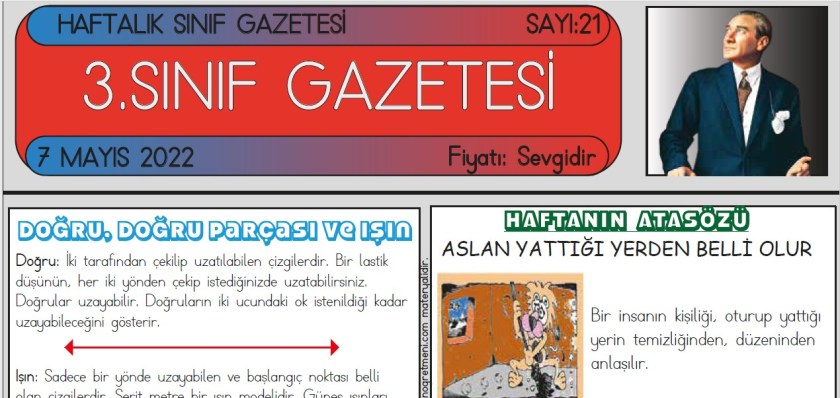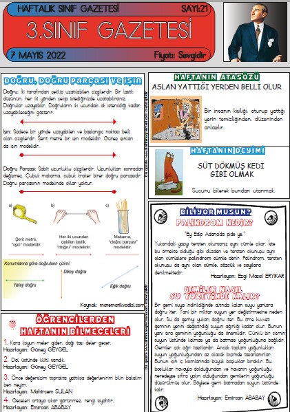 SINIF GAZETEMİZİN 21. SAYISI ÇIKTI Mayıs 7, 2022 sinifininogretmeni SINIF GAZETESİ Yorum bırakın SINIF GAZETESİ SAYI 21 SINIF GAZETEMİZ YAYIMLANDI 3. Sınıf gazetemiz yirmi birinci sayısı ile yayında. Gazetemiz 6 Kasım 2021 den itibaren her hafta düzenli olarak yayımlanmaktadır. ESKİ SAYILARIMIZ SAYI10 – SAYI 11 – SAYI 12 – SAYI 13 – SAYI14 – SAYI15 – SAYI16 – SAYI 17 – SAYI 18 -SAYI 19 SAYI 20 >>>>>> 21. SAYI TIKLA İNDİR <<<<<< Bunu paylaş: Facebook üzerinde paylaş (Yeni pencerede açılır) Facebook WhatsApp'ta paylaş (Yeni pencerede açılır) WhatsApp Telegram'da paylaş (Yeni pencerede açılır) Telegram X'te paylaşın (Yeni pencerede açılır) X Beğen Yükleniyor... İlgili